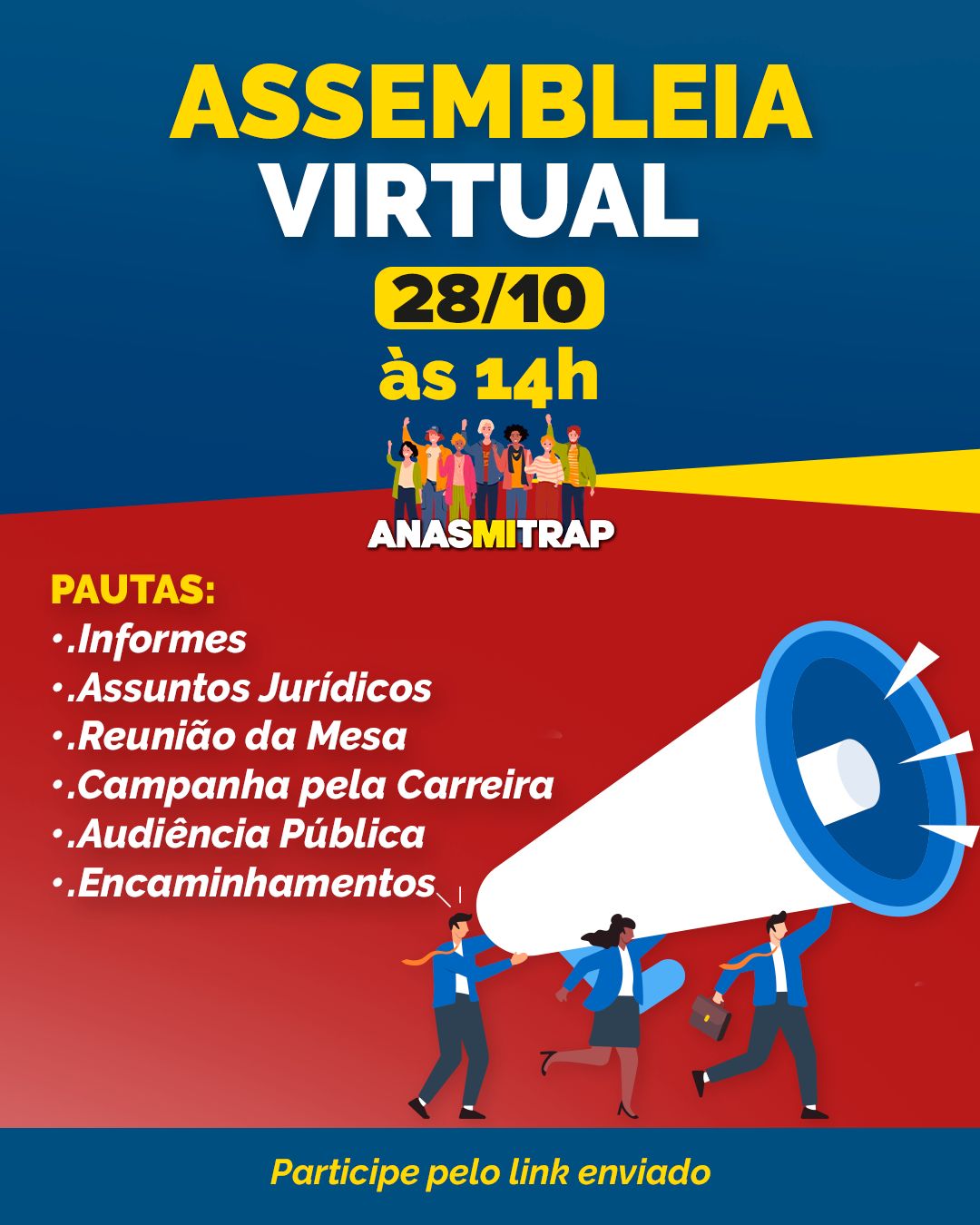 A ANASMITRAP (Associação Nacional dos Servidores Administrativos dos Ministérios do Trabalho e Emprego e da Previdência Social) convoca todos os associados para uma Assembleia Geral Extraordinária, a ser realizado a próxima terça-feira, 28 de outubro, às 14h, de forma virtual, pelo link de sempre: https://carreiradotrabalho.com.br/