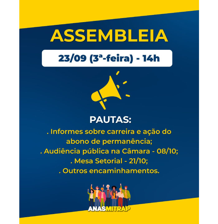 A ANASMITRAP (Associação Nacional dos Servidores Administrativos dos Ministérios do Trabalho e Emprego e da Previdência Social) convoca todos os associados para uma assembleia, a ser realizado a próxima terça-feira, 23 de setembro, às 14h, de forma virtual, pelo link de sempre: https://carreiradotrabalho.com.br/
