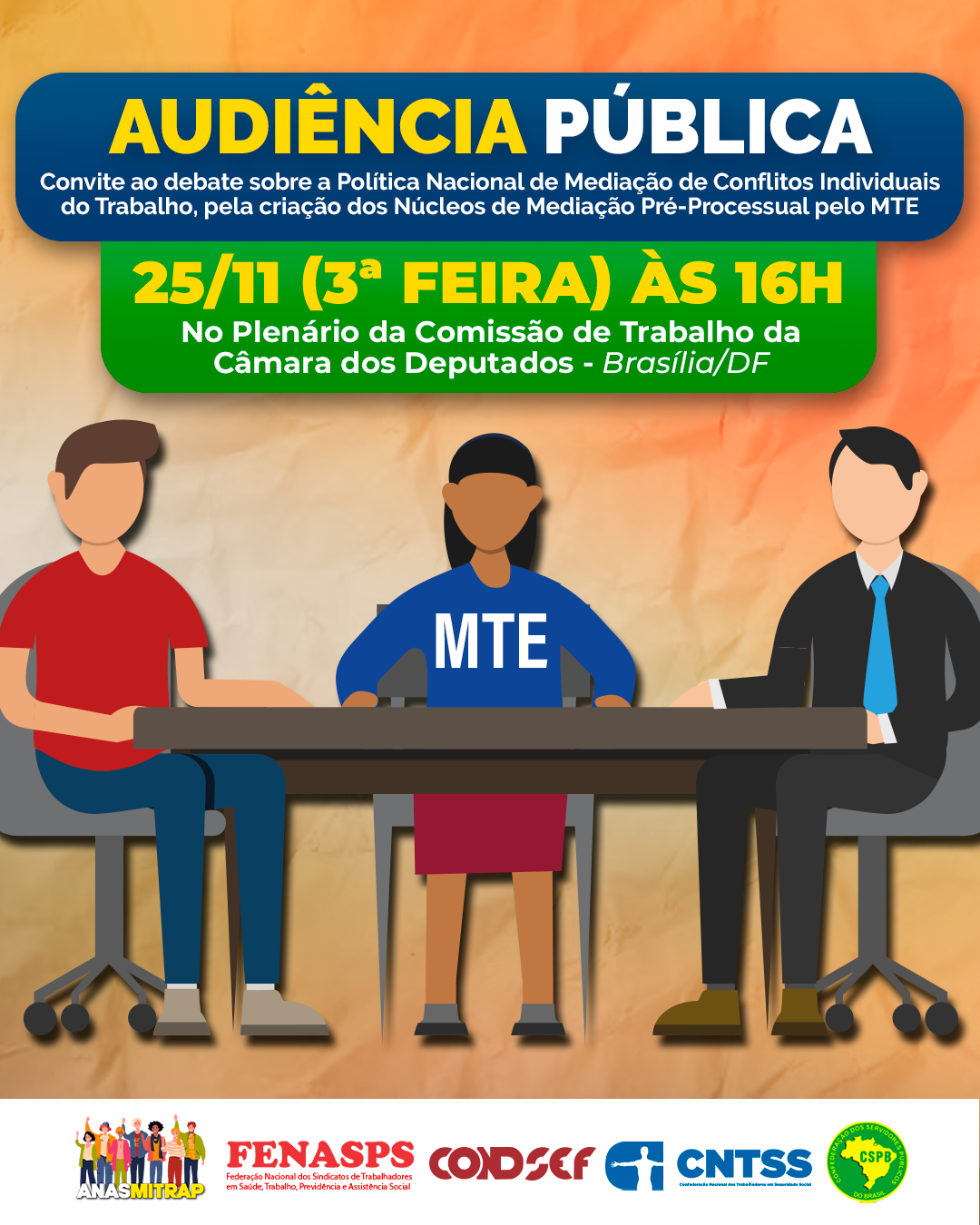 A ANASMITRAP, CONDSEF, FENASPS, CNTSS e CSPB convidam todas e todos para participarem da Audiência Pública da Comissão de Trabalho da Câmara dos Deputados, que debaterá a Política Nacional de Mediação de Conflitos Individuais do Trabalho, um projeto que representa um avanço histórico na resolução de conflitos trabalhistas no Brasil.