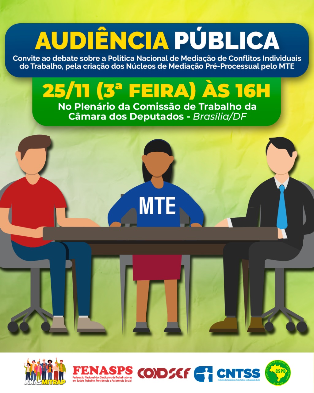 As entidades ANASMITRAP, CONDSEF, FENASPS, CNTSS e CSPB convocam todos os servidores e representantes sindicais para participar da Audiência Pública da Comissão de Trabalho da Câmara dos Deputados, que discutirá a Política Nacional de Mediação de Conflitos Individuais do Trabalho. Trata-se de uma iniciativa inédita que busca modernizar a forma como o Brasil trata os conflitos trabalhistas e fortalecer as políticas públicas de trabalho, emprego e renda.